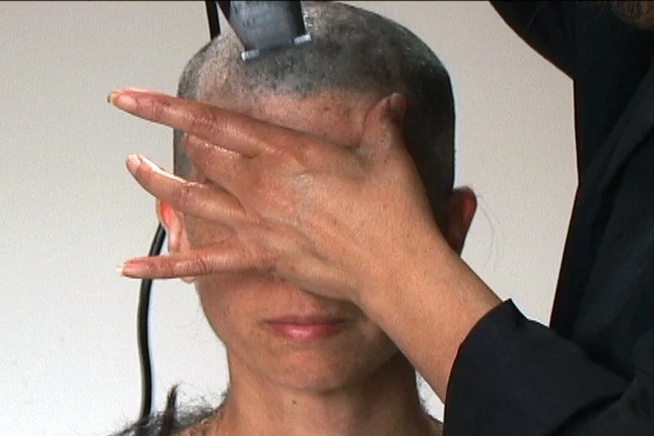 ZeroPointTwo, a video collaboration between sound artist Thea Farhadian and visual artist Heike Liss presents a poetic and simultaneously disturbing account of a woman having her head shaved. The work moves between states of ordinary consciousness and the collective unconsciousness. The metaphorical, cultural, political, historical, aesthetic, and religious connotations of head shavings trigger images of monks, skinheads, soldiers, cancer patients, political prisoners, witches and women attempting to break out of boundaries defined by society at large. Filmed in real time, ZeroPointTwoinvites the viewer to enter an intimate and complex ontological space.